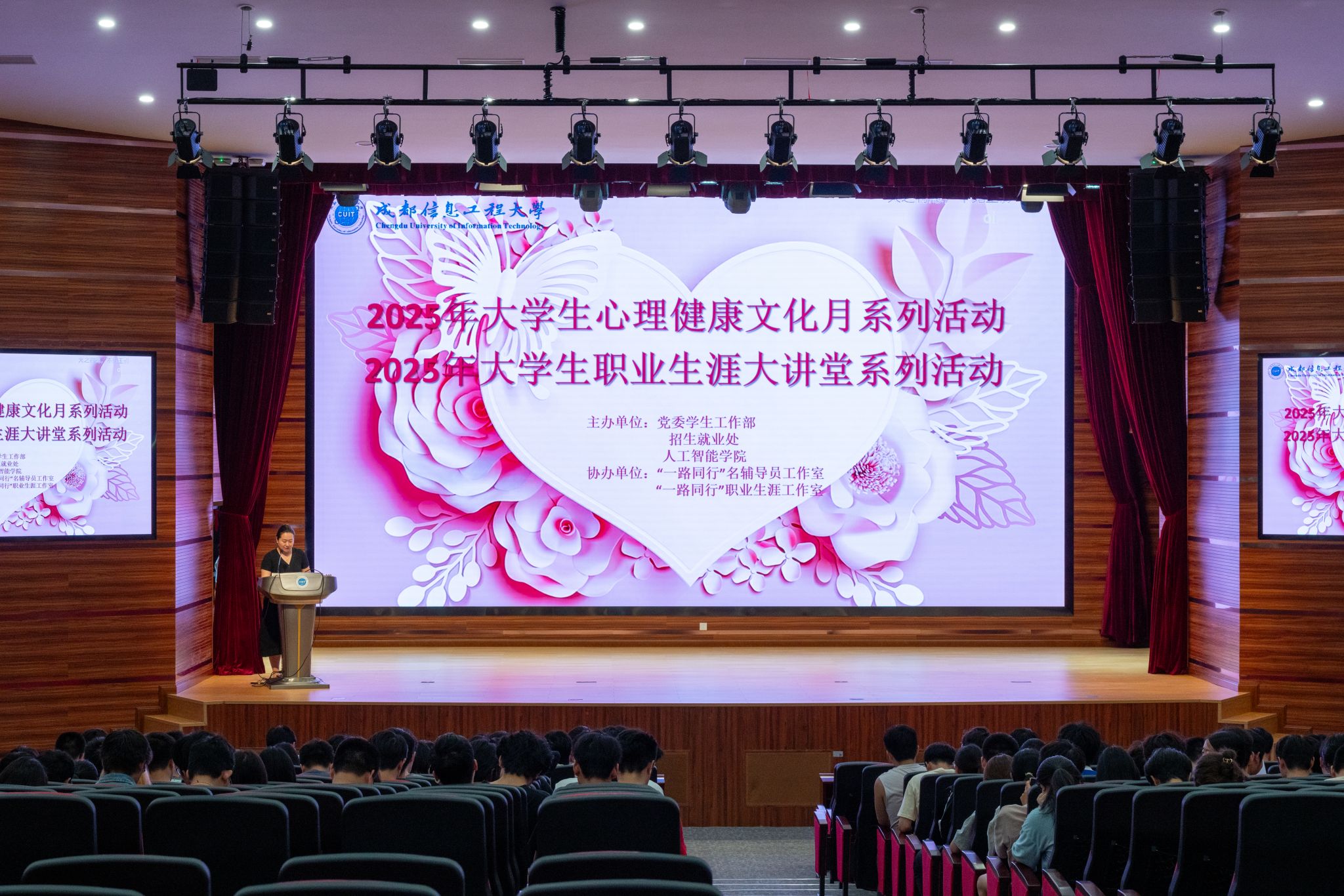 为全面推进新时代大学生心理健康教育工作,结合学校525心理健康月系列活动,帮助同学们更好地应对学业、人际与未来发展的多重压力,5月28日晚,由学生工作处、招生就业处和人工智能学院联合主办,“一路同行”名辅导员工作室/职业生涯工作室协办的“大学生压力突围:认知重塑与行动破局”心理健康主题讲座在成信礼堂举行。本次讲座特别邀请西南民族大学教育学与心理学学院教师、北京师范大学心理学博士姚小喃主讲。