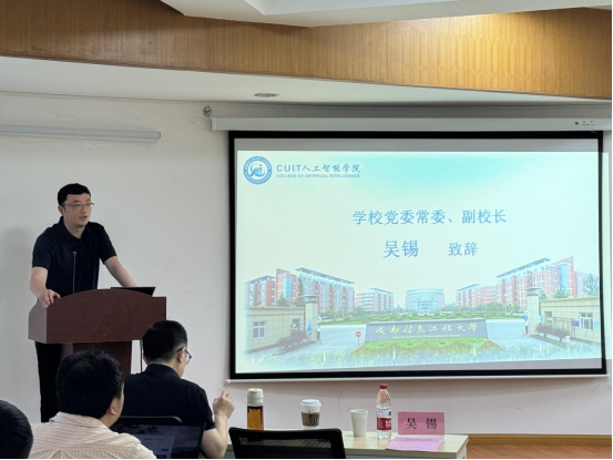 吴锡为本次会议致辞。他对学院近几年在学科建设、人才培养等方面所取得的成绩给予了充分肯定,并着重指出,在当前人工智能技术飞速发展,且广泛应用于各领域的大背景下,学院应牢牢把握机遇,迎接挑战,进一步强化学科专业特色建设,持续提升人才培养质量。同时他以自身经历勉励学院教职工要有进取精神,杜绝“躺平”,抓准时代机遇,结合学校特色优势提升自身的教学科研水平。