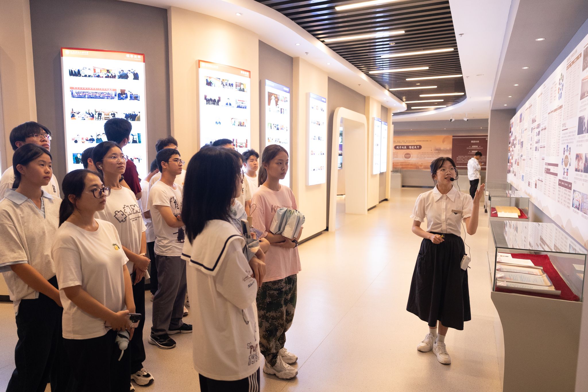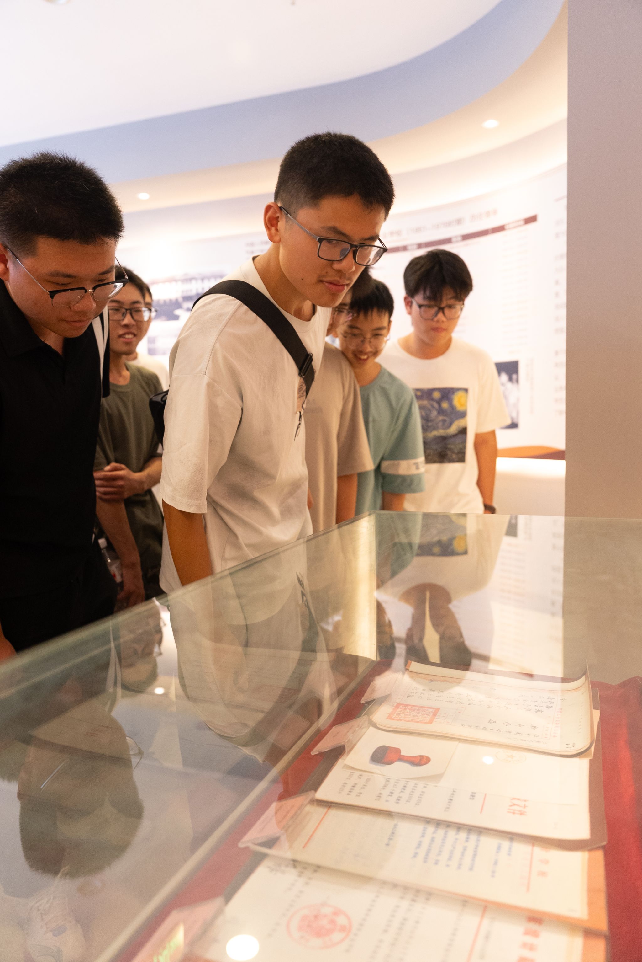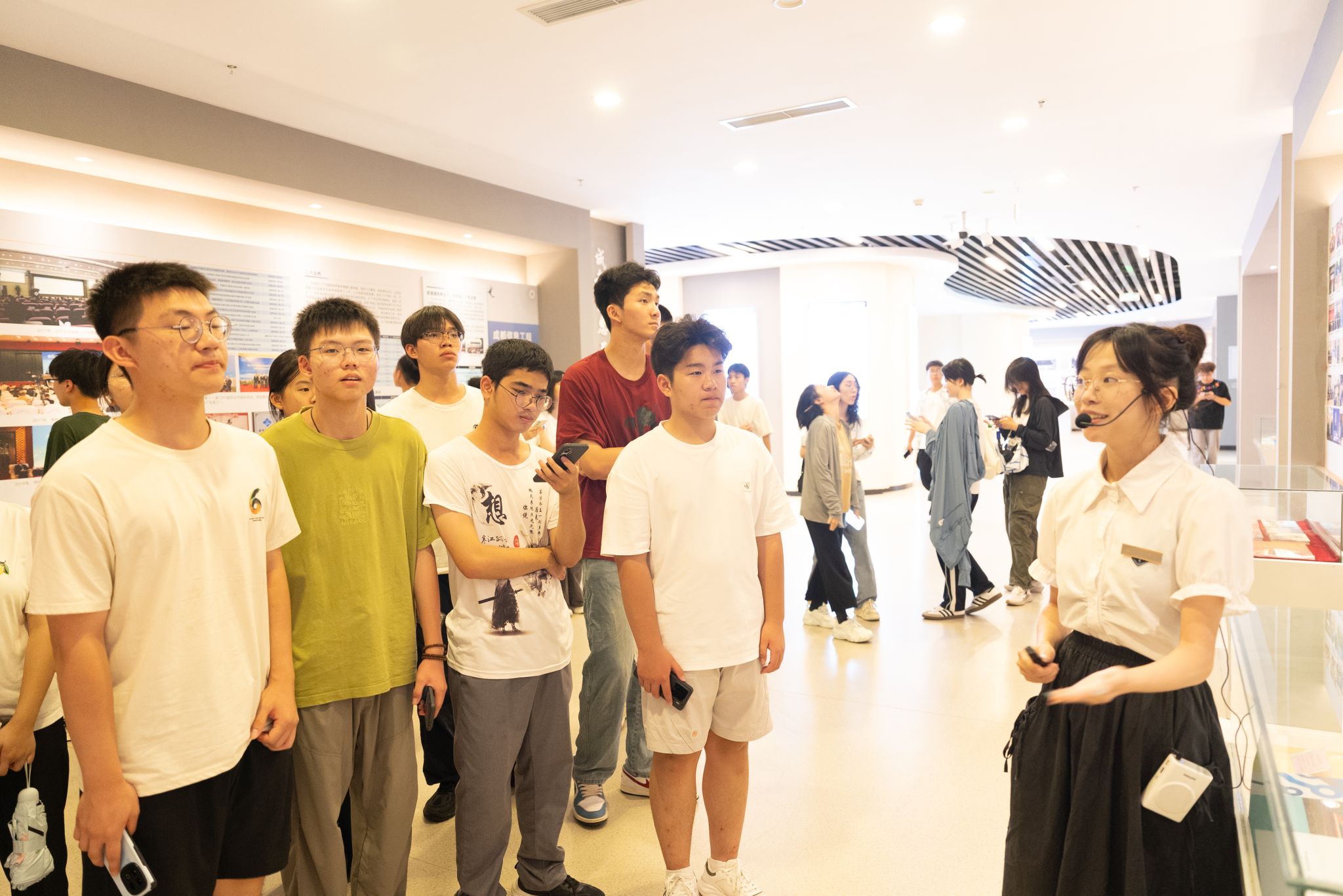 在这里,同学们深刻感受到学校的深厚积淀。同学们跟随解说员的指引,在一幅幅定格珍贵瞬间的历史影像前凝神端详。这些斑驳却依然生动的画面,串联起学校从筚路蓝缕到蓬勃发展的峥嵘岁月。透过镜头记录下的每一个历史性时刻,同学们深切体会到历代成信人坚守理想、矢志不渝的执着追求,对"成于大气,信达天下"的校训精神有了更为具象而深刻的感悟。一种作为新时代成信人的使命感在心中油然而生,仿佛接过了一份需要持续书写的历史答卷。
