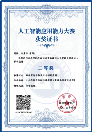 近日,四川省教育厅公布了首届教师人工智能应用能力大赛获奖名单,人工智能学院教师在本次大赛中取得优异成绩。刘强、刘露平老师的参赛作品《大二年级区块链工程学科《数据库原理及应用》》荣获高等教育(方向二:AI智能体开发与创新应用)二等奖。