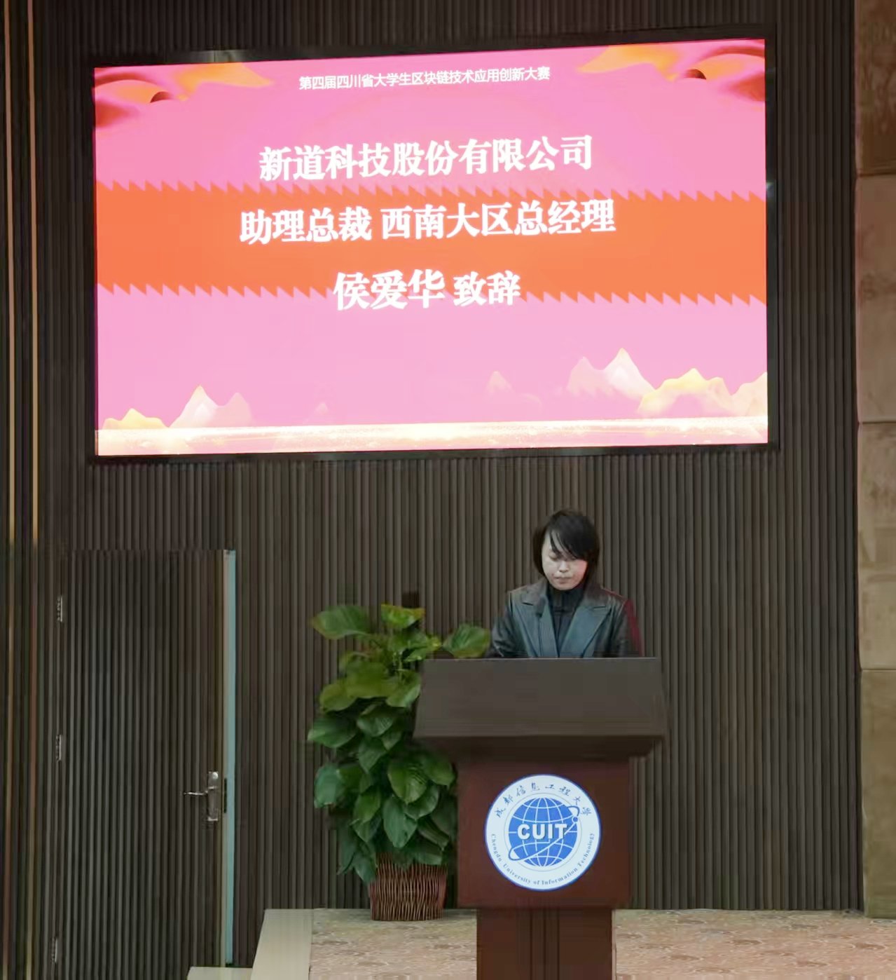 侯爱华在致辞中阐述了支持本届区块链大赛的初衷。她表示,大赛的核心目的在于“以赛促学、以赛促创”,激发大学生的创新潜能,为区块链产业发现和储备优秀的青年人才。她特别表达了对深化产教协同的期待,希望高校教育能与产业前沿需求更紧密地结合,推动教育链、人才链与产业链、创新链的有机衔接。