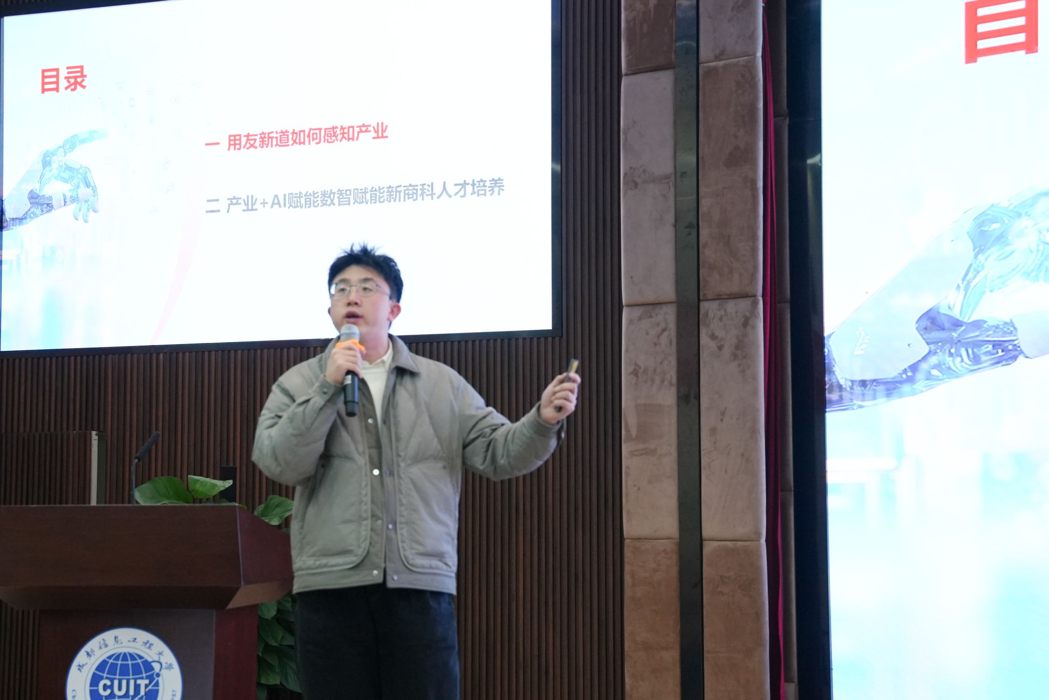 新道科技高级教育规划顾问杨瑞杰以《AI 驱动下新商科专业建设探索与实践》为题,探讨了AI 技术对新商科专业建设的赋能路径,展现了跨学科融合的发展潜力。