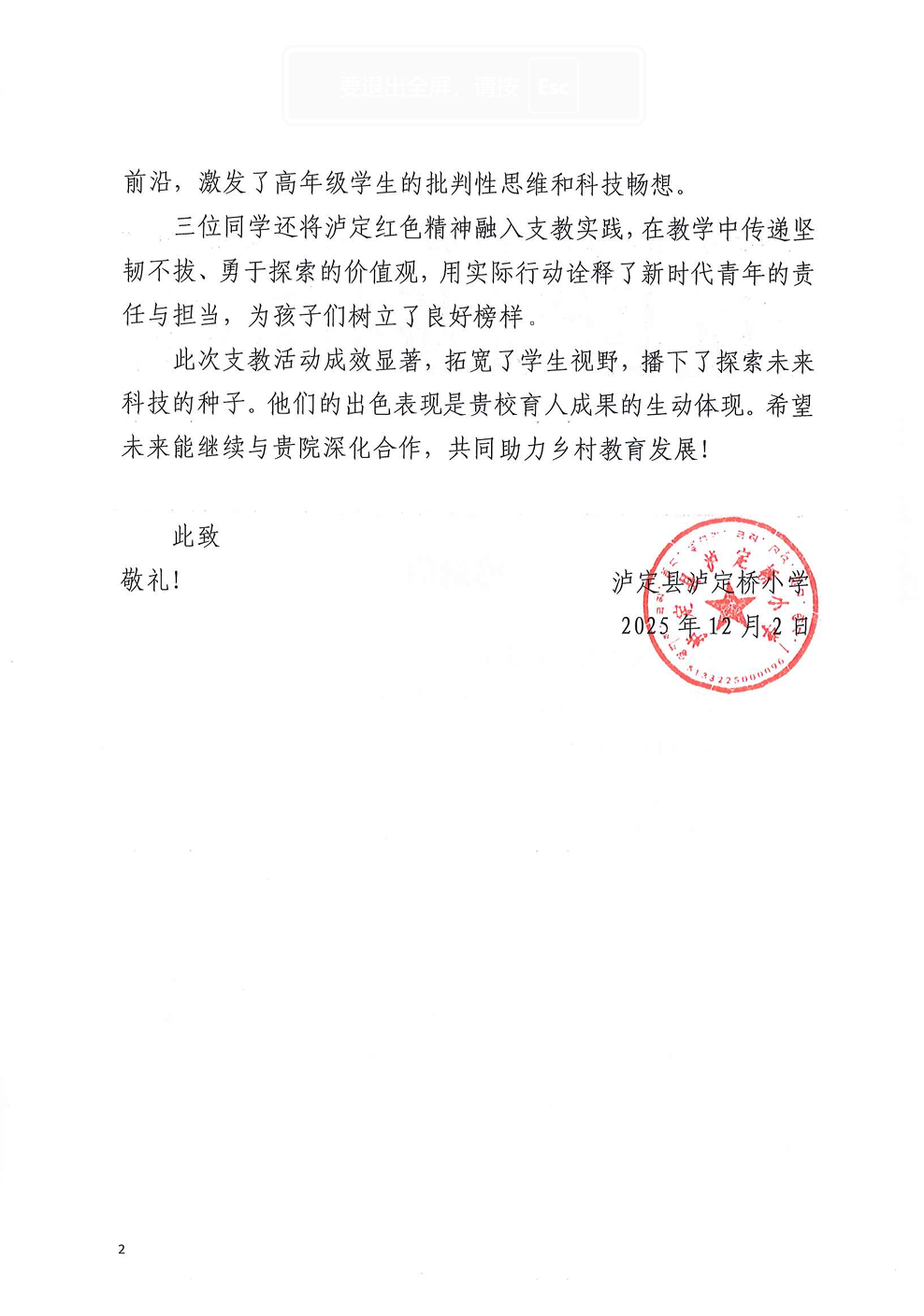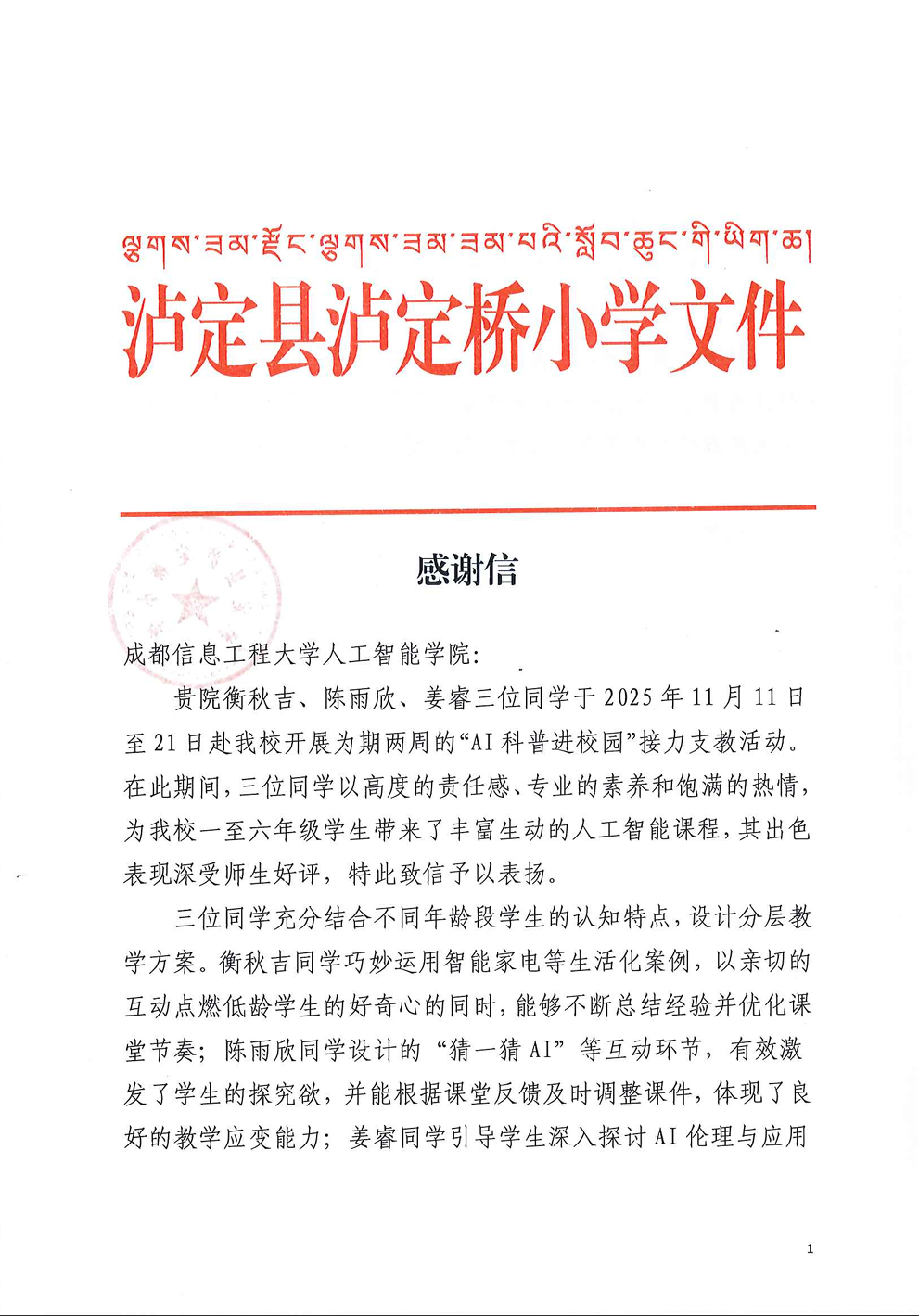 近日,我院收到来自四川省泸定县泸定桥小学的一封感谢信,信中对衡秋吉、陈雨欣、姜睿三位同学在“AI科普进校园”接力支教活动中的出色表现予以高度赞扬。此次支教不仅为乡村孩子们打开了人工智能的奇妙世界,更展现了我院学子卓越的专业素养与青春担当,赢得了受援学校师生的一致好评。