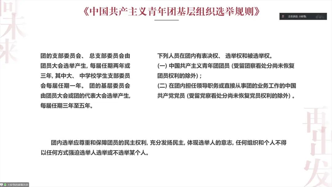 在团校第二课中,罗霞老师根据《中国共产主义青年团基层组织选举规则》,介绍团发展工作细则、基层组织选举。