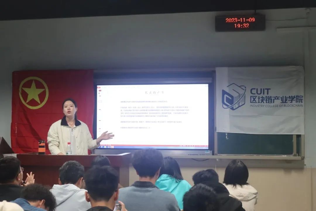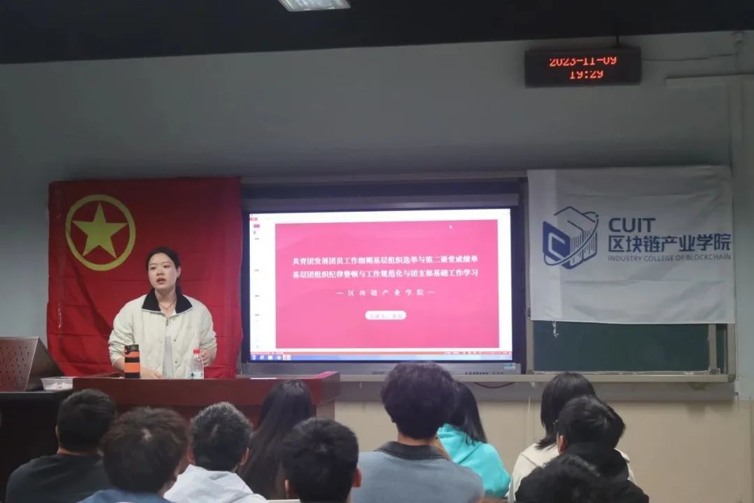 2023年11月9日,区块链产业学院组织召开第四期团校关于“共青团发展团员工作细则,基层组织选举,第二课堂成绩单以及基层团组织纪律整顿与工作规范化与团支部基础工作学习”主题的团课,由学院分团委书记罗霞老师主讲。